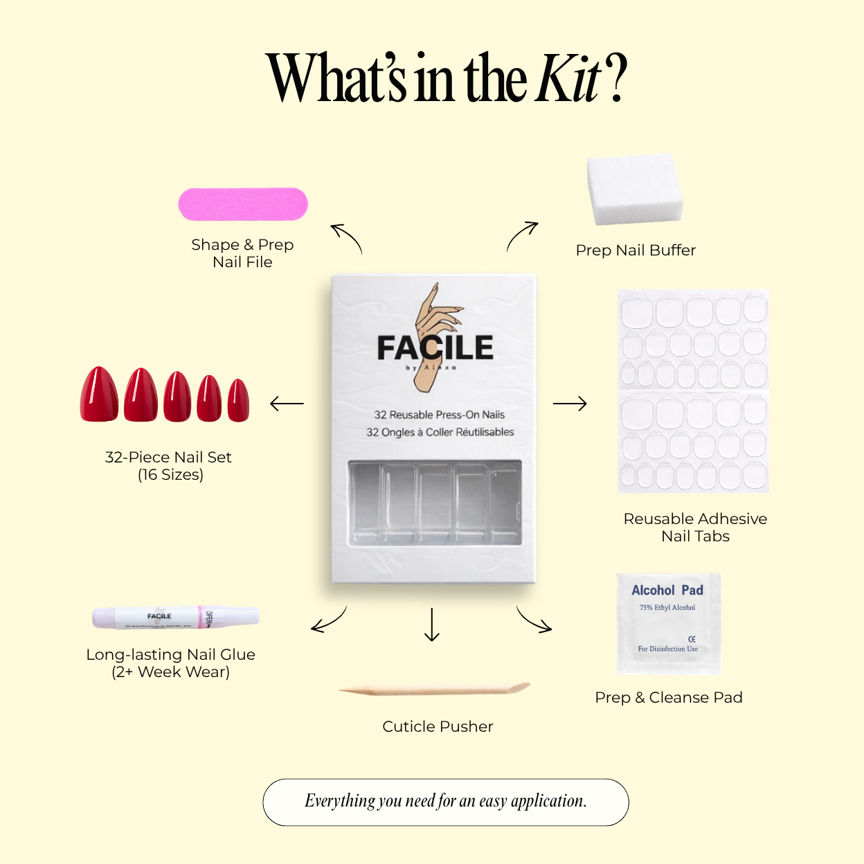 Veuillez vous référer à l'onglet ‘COMMENT FAIRE’ pour des conseils et astuces sur la façon d'appliquer correctement les ongles.