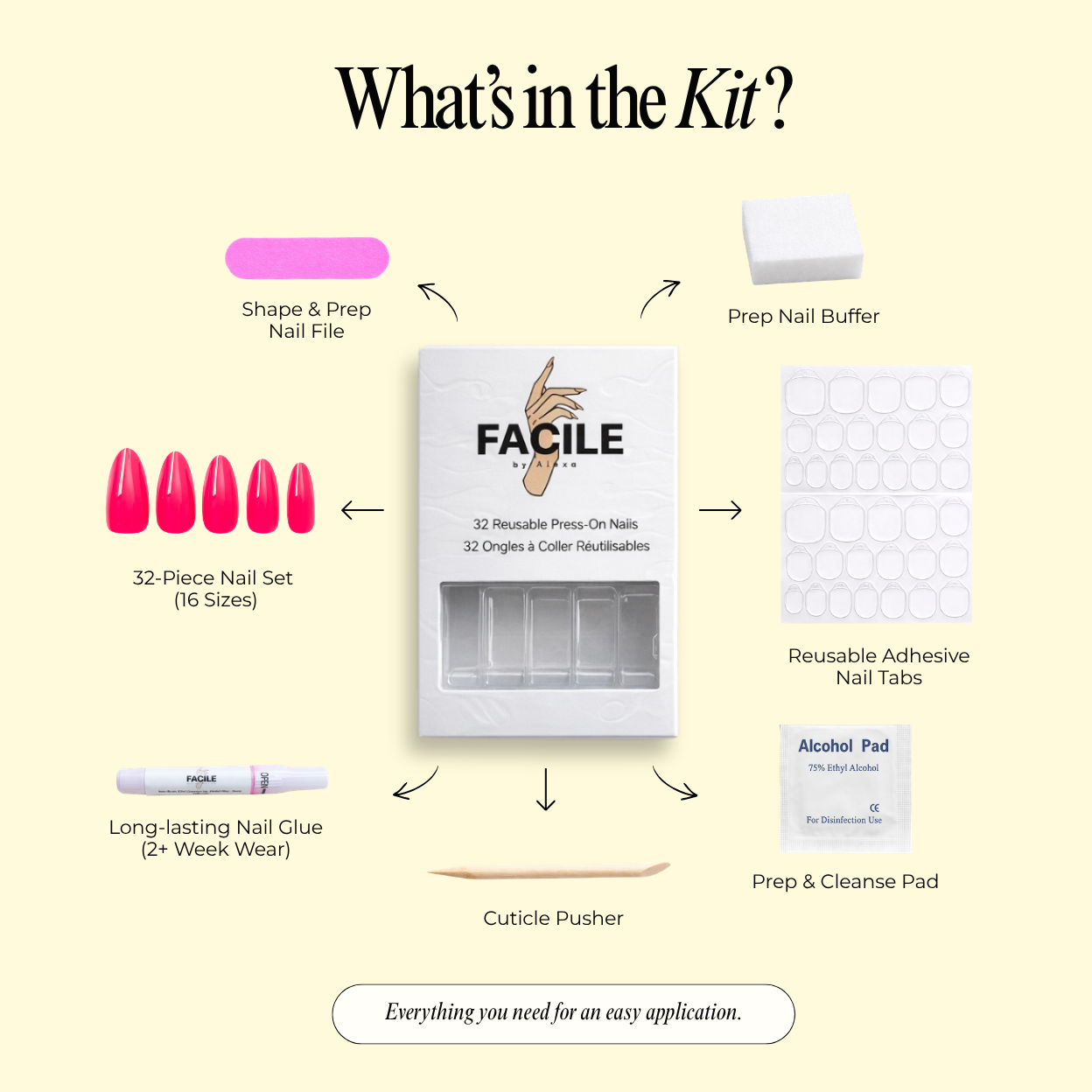 I received so many compliments on these nails and they lasted me a very long time with just the nail tabs. Also, now that the packs come with 32 nails, the fit is soo much better. Facile nails is the best for high quality press ons and I can’t wait to add more to my collection!